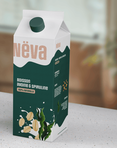 Boisson au lait d'avoine et spiruline et boisson au lait d'amande et maca.