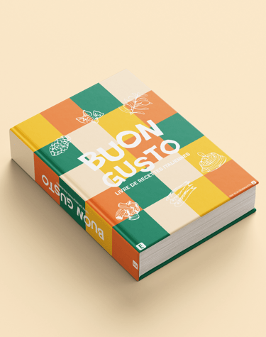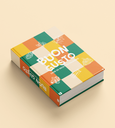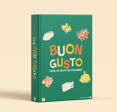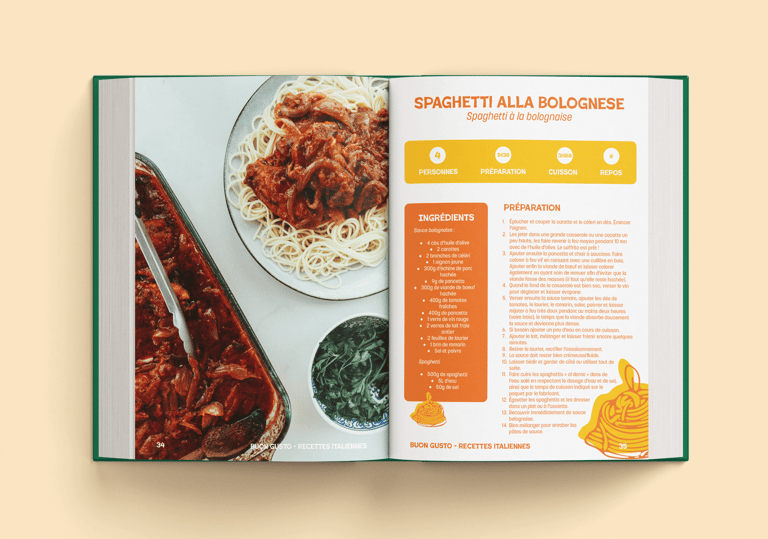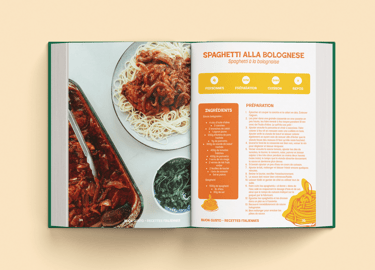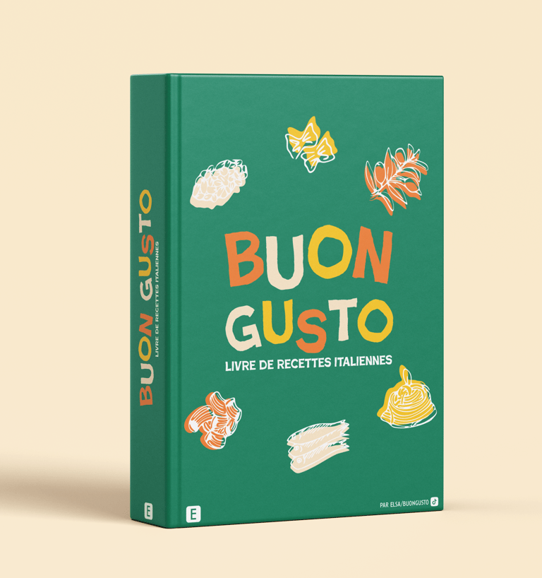 Création originale pour la couverture et la mise en page d'un livre de recettes italiennes créer par une tiktokeuse se nommant Elsa.